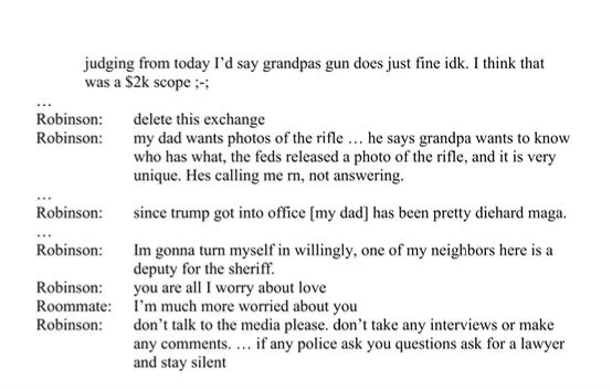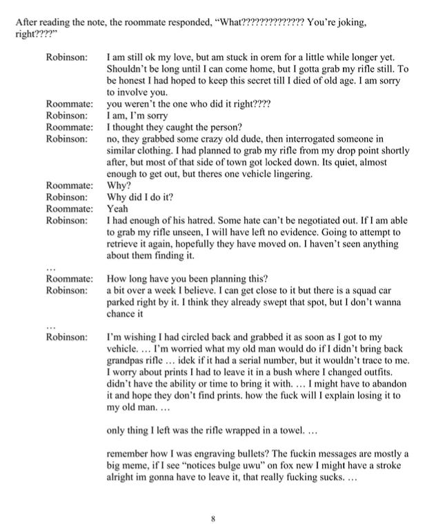 Yet Robinson's messages claim contradictory locations. He writes he's "stuck in Orem for a little while longer" and trying to "grab my rifle still." Later he describes specific police positions: "There is a squad car parked right by it. I think they already swept that spot."