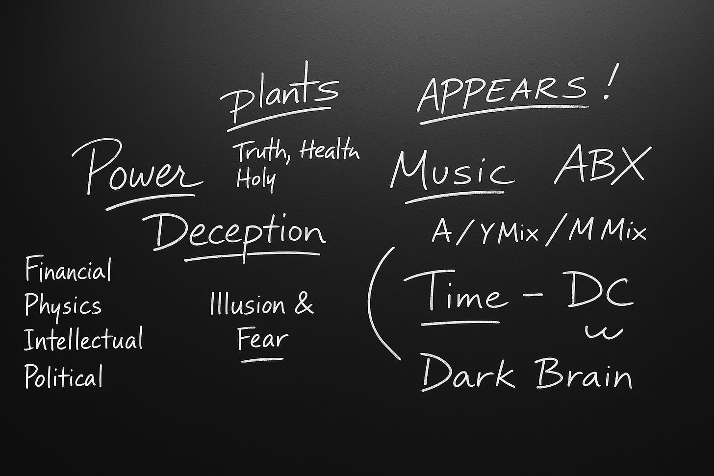 The categories describe domains of power to infiltrate: financial systems, intellectual institutions, political networks. “Deception” defines the method—creating illusions and managing fear. “Plants” outlines the intelligence profile needed on each target: their truth (what they really want), their health (where they’re vulnerable), their holy (what will compromise them).
