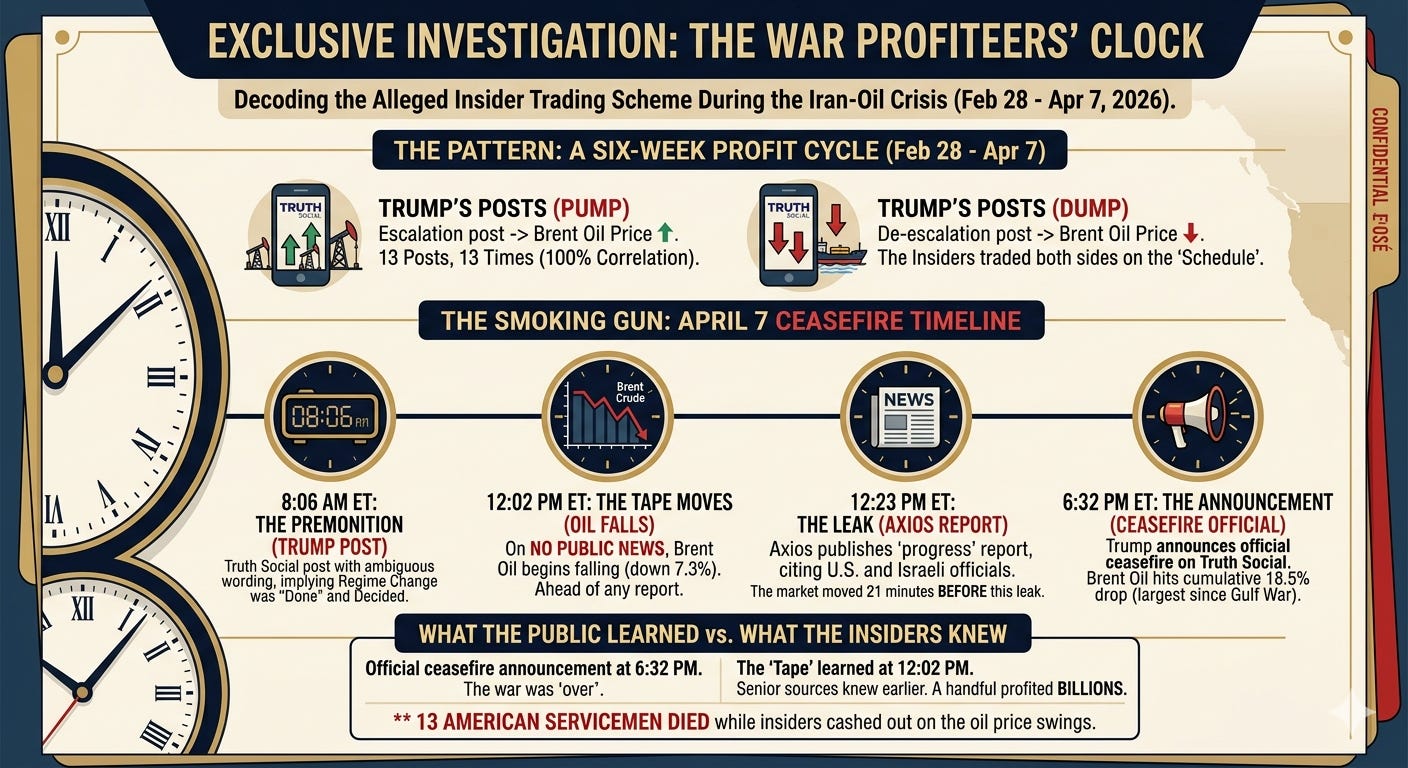 Today’s stories are one story told five ways. An Iran ceasefire was traded on in advance across three markets because Trump held the announcement long enough for the window to open. Netanyahu is being set up as the global villain because the trade needs the peace to clear. A NATO ally is being actively destabilized by the same administration, using the same playbook Russia ran on Ukraine. This White House does not distinguish between foreign policy and personal leverage — not on Iran, not on Canada, not on its own markets. The SEC probe Ritchie Torres has demanded is the first real test of whether any American institution is still willing to say so.