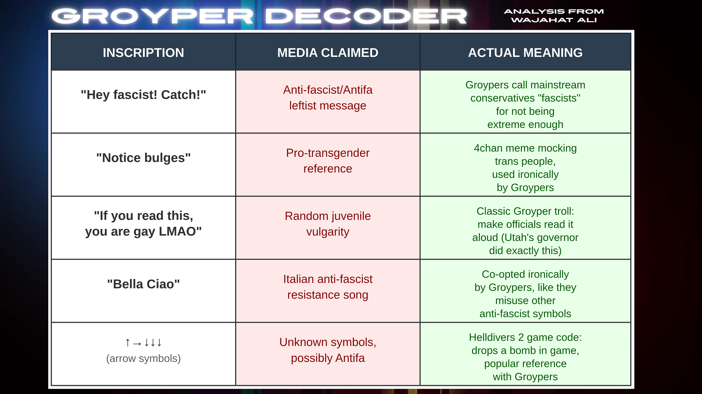 As Was explained, these aren't random - they're "idioms and catchphrases used within the 4chan subculture of Groypers." Even 4chan users are saying "we think this guy's one of us." bullet inscriptions - "Hey fascist! Catch!" and "If you read this, you are gay LMAO" - are straight from 4chan Groyper culture, not leftist ideology.