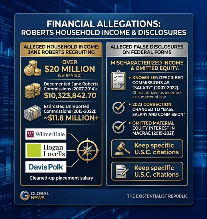 For sixteen years, Roberts has been calling something on his federal disclosure forms a salary that is not a salary. His wife, Jane Sullivan Roberts, is a legal headhunter. She places senior lawyers — the kind leaving government, the kind firms pay top dollar for — at law firms that argue cases at the Supreme Court. WilmerHale. Hogan Lovells. Davis Polk. When one of those firms hires her candidate, the firm pays her a commission. Sometimes hundreds of thousands of dollars per placement. A 2022 whistleblower complaint from inside her former firm walked the spreadsheets to Congress: more than ten million dollars in commissions over seven years. Add the years that followed at her next firm, where the public numbers go dark, and the floor estimate runs past twenty million dollars. From the firms that argue in front of her husband.