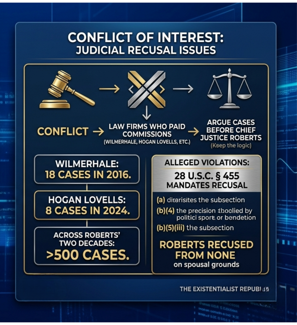 Roberts called it salary. “Commission is influenced by outcome in a way that salary isn’t as directly,” Armitage said. The Chief Justice picked the word that hides the conflict. The whistleblower was a clerk and an attorney. She knew what she was looking at. Congress held a hearing. The story quietly disappeared. About a third of the cases Roberts has weighed in on have involved firms his wife recruited for. He has not recused from a single one.