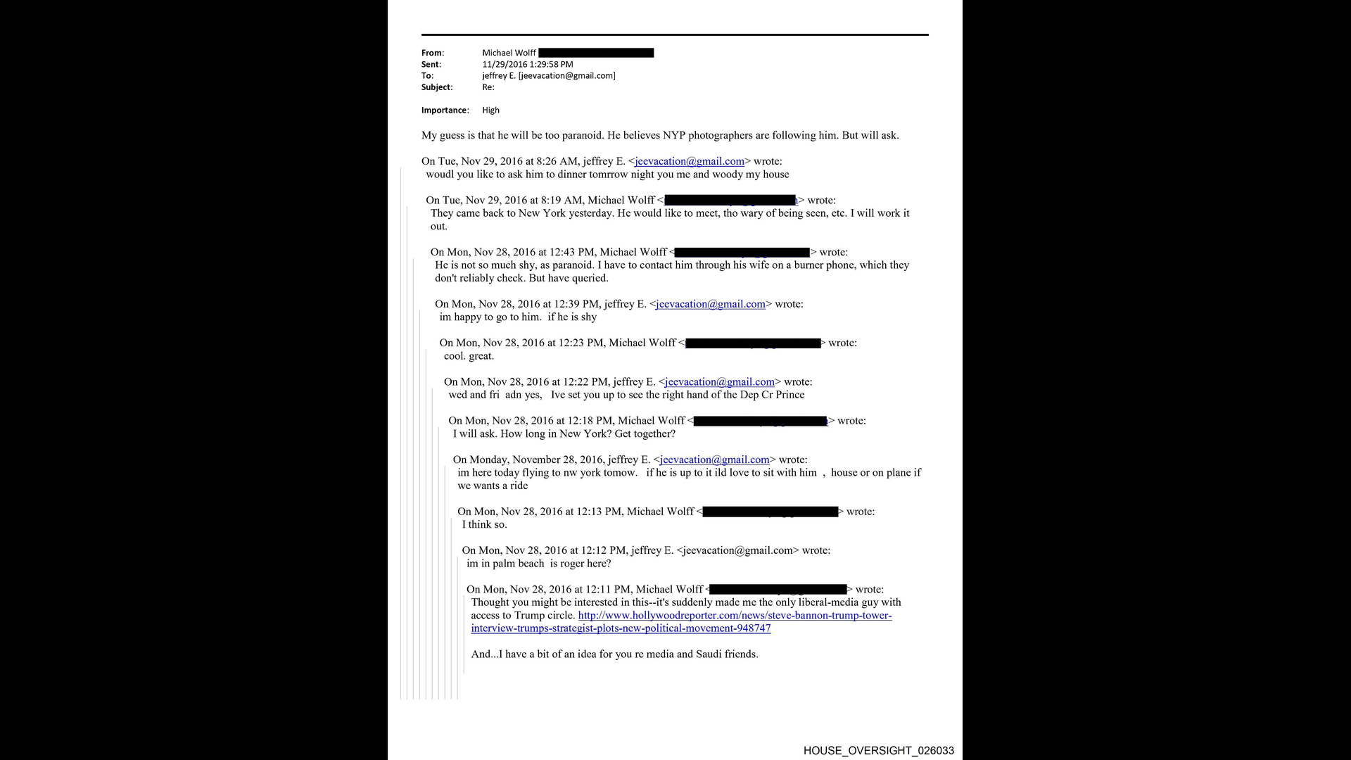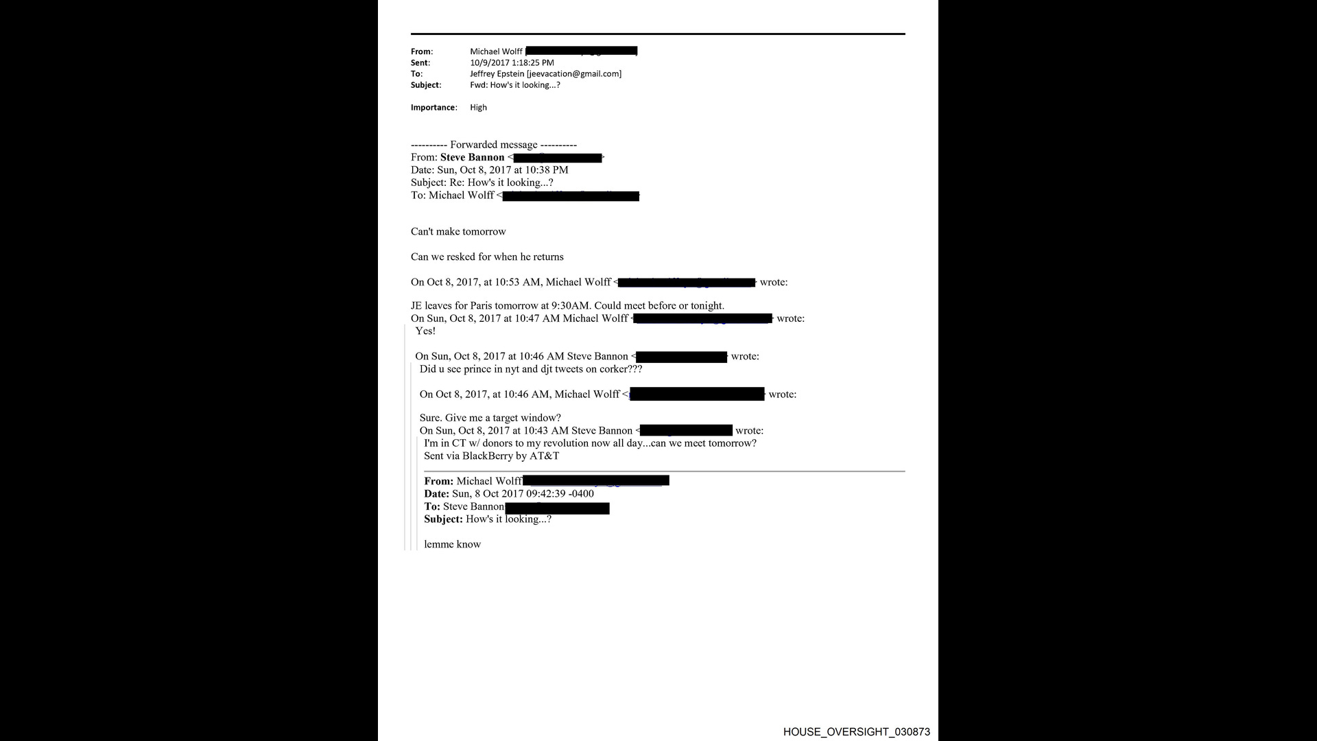 October 2017. Wolff forwards emails from Steve Bannon to Epstein, coordinating a meeting. This is while Wolff is reporting “Fire and Fury,” published three months later.