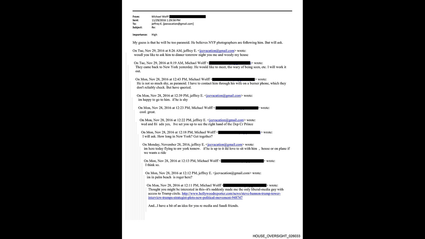 November 2016, after Trump’s election. Wolff tells Epstein: “I’m suddenly the only liberal-media guy with access to Trump circle.” Epstein arranges dinners with Woody Allen, plane rides, meetings with the “right hand of the Dep Cr Prince.” Wolff tells Epstein he has “an idea for you re media and Saudi friends.”