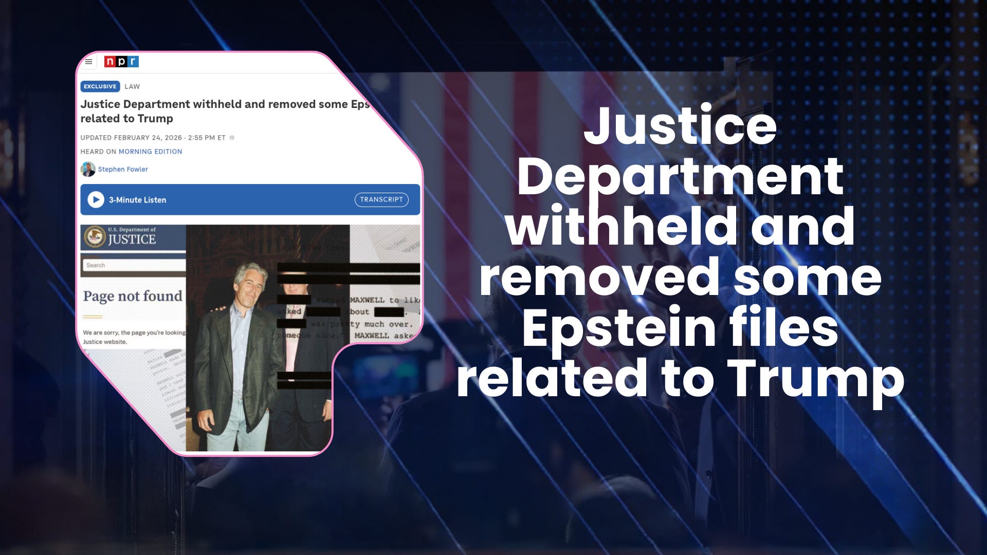 Hours before Donald Trump delivered his State of the Union address, the Epstein case detonated on multiple fronts — and the FiveStack brought Denver Riggleman and Lev Parnas along for a special prime time broadcast to cover it all live. NPR confirmed what Roger Sollenberger first reported on Substack: the Trump Justice Department has withheld or removed 53 pages of FBI interviews with women who accused Trump of sexually assaulting them as minors. One woman was interviewed by the FBI four times — credible enough for four separate sit-downs — and only the first interview, the one that doesn’t mention Trump, made it into the public database. A second woman described being taken to Mar-a-Lago as a minor, where Epstein introduced her to Trump and said, according to the FBI document, “This is a good one, huh.” That interview was removed from the database after publication and restored only after Sollenberger flagged it. “They basically covered up for the president of the United States,” Zev said. “And they have no interest in giving us the truth.”