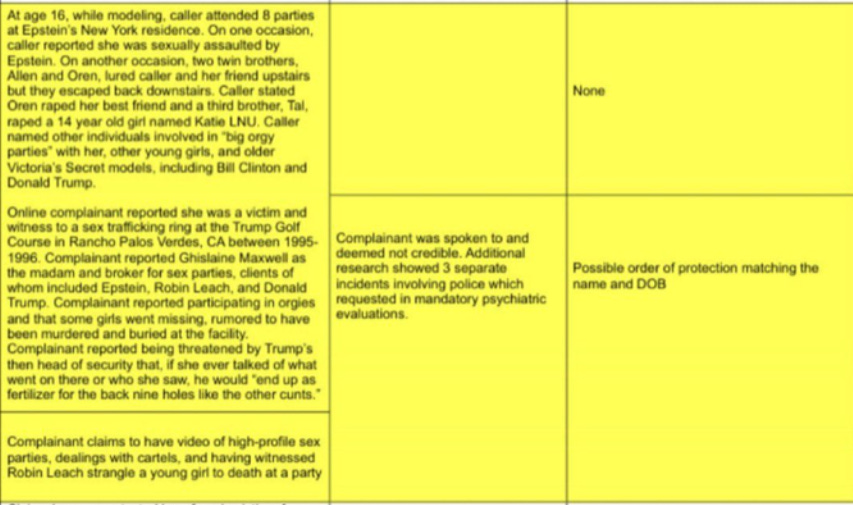 According to the intake, X called the FBI to report that Donald Trump “knew about and funded underage sex parties” at the Rancho Palos Verdes golf course. The parties were brokered by Ghislaine Maxwell.