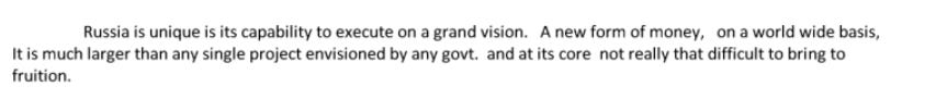 “Russia is unique is its capability to execute on a grand vision. A new form of money, on a world wide basis. It is much larger than any single project envisioned by any govt. and at its core not really that difficult to bring to fruition.”