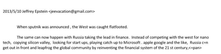 “When sputnik was announced, the West was caught flatfooted. The same can now happen with Russia taking the lead in finance. Instead of competing with the west for nano tech, copying silicon valley, looking for start ups, playing catch up to Microsoft, apple, google and the like, Russia can get out in front and leapfrog the global community by reinventing the financial system of the 21st century.”