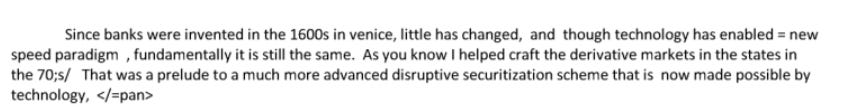 “Since banks were invented in the 1600s in venice, little has changed, and though technology has enabled a new speed paradigm, fundamentally it is still the same. As you know I helped craft the derivative markets in the states in the 70s. That was a prelude to a much more advanced disruptive securitization scheme that is now made possible by technology.”