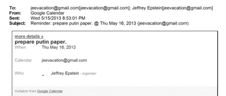 The very next day, Epstein set a Google Calendar reminder: “prepare putin paper.” He wasn’t just talking. He was preparing a formal pitch for Vladimir Putin.