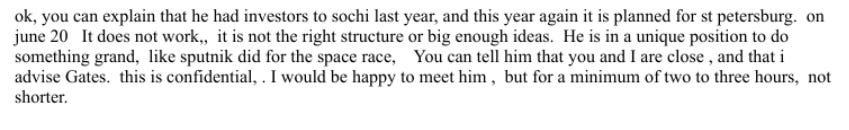 “ok, you can explain that he had investors to sochi last year, and this year again it is planned for st petersburg. on june 20. It does not work, it is not the right structure or big enough ideas. He is in a unique position to do something grand, like sputnik did for the space race. You can tell him that you and I are close, and that i advise Gates. this is confidential. I would be happy to meet him, but for a minimum of two to three hours, not shorter.”