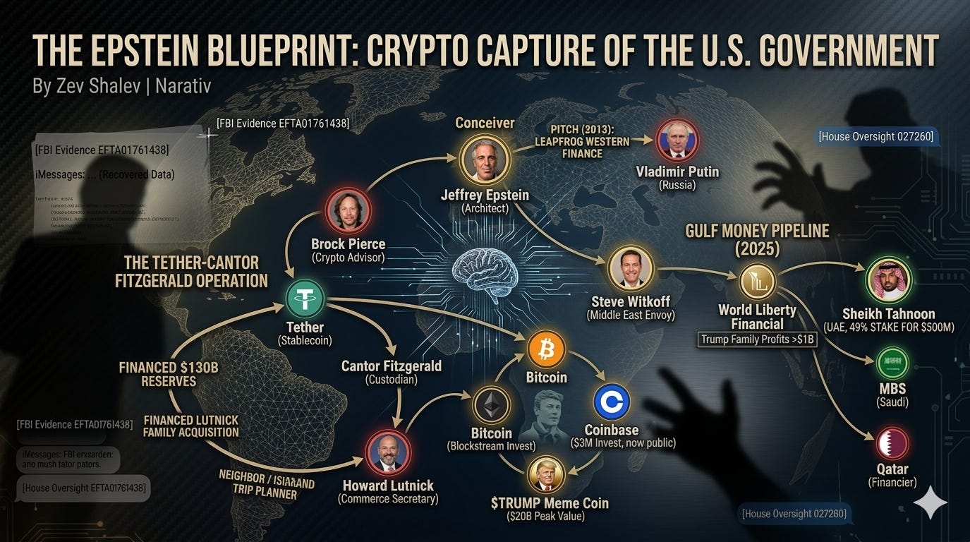 FBI documents reveal Epstein personally pitched Vladimir Putin on using cryptocurrency to reinvent global finance. Epstein invested at every level: exchanges (Coinbase), protocols (Blockstream), and, through crypto advisor Brock Pierce, the stablecoin Tether—now the reserve currency of crypto. Howard Lutnick, who controls Tether’s reserves, was Epstein’s neighbor and planned visits to his private island. Steve Witkoff, Trump’s Middle East negotiator, co-founded a crypto company that received $500 million from a UAE intelligence-linked sheikh right before the inauguration.
