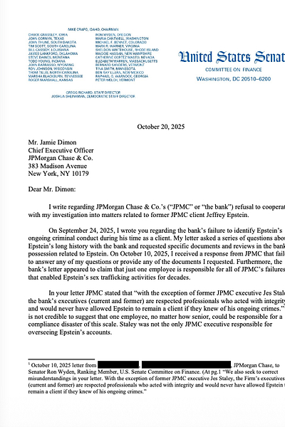 Wyden isn’t having it. His second letter to Dimon, released last week, demands the internal communications, the “Project Jeep” review JPMorgan conducted after Epstein’s second arrest, and every document related to why the bank waited six years to report transactions it knew were suspicious in 2013.