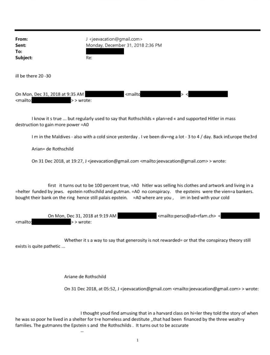 Epstein understood this architecture intimately. In a December 2018 email to Ariane, he described a Harvard class on Hitler’s years of destitution, during which the future dictator lived in a shelter funded by three wealthy Viennese families: “The Gutmanns, the Epsteins, and the Rothschilds.” Epstein added: “the Epsteins were the Vienna bankers. Bought their bank on the ring, hence still Palais Epstein.”