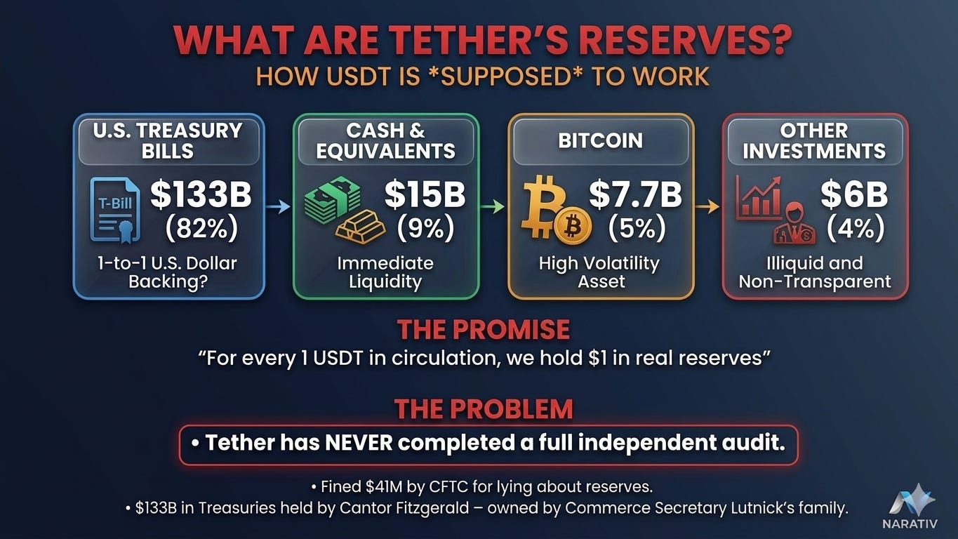 Tether is a stablecoin — a digital token pegged to the U.S. dollar. For every token issued, Tether claims to hold one dollar in reserve. At $184 billion in circulation, it is the largest non-sovereign holder of U.S. short-term Treasury bills on Earth — larger than the holdings of most allied nations. Those bills — $133 billion worth — are custodied by Cantor Fitzgerald, the Wall Street firm whose family ownership now depends on a loan from Tether itself.
