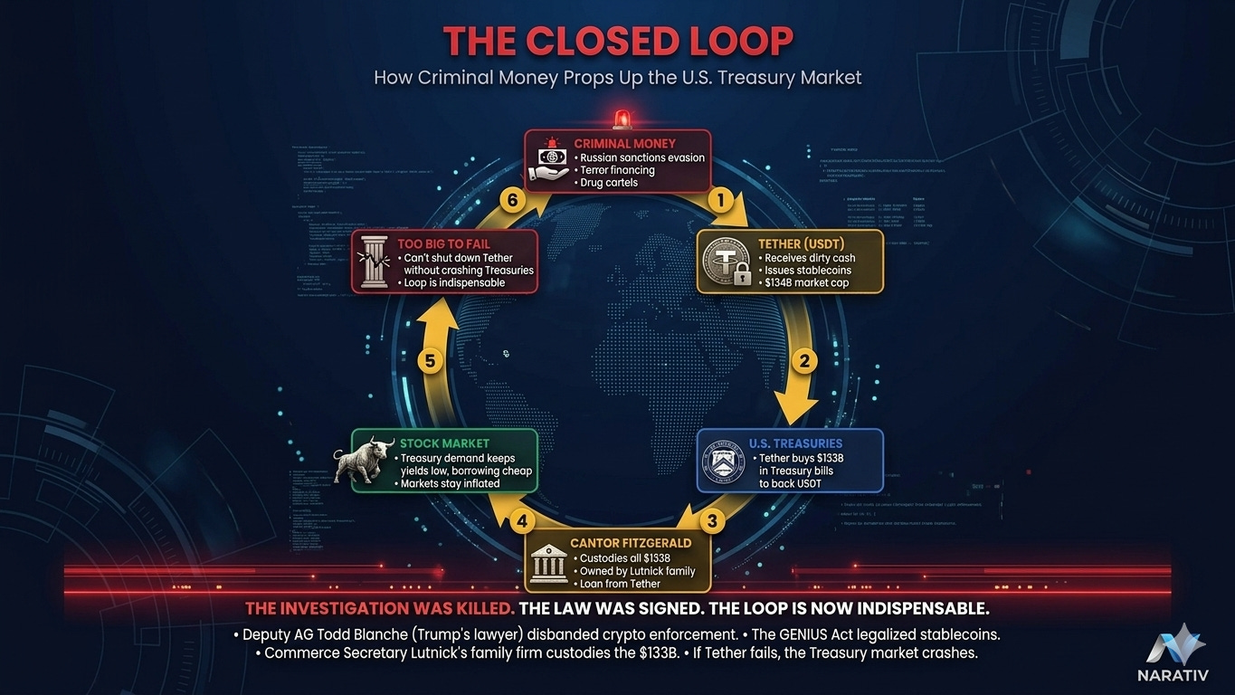 Commerce Secretary Howard Lutnick's entire private family fortune, including Cantor Fitzgerald, is financed by Tether, a Russian money laundering front operating as a stablecoin.