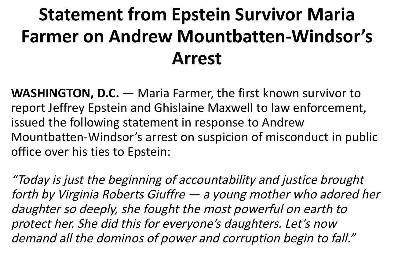 Maria Farmer, the first known survivor to report Jeffrey Epstein and Ghislaine Maxwell to law enforcement, issued a statement : “Today is just the beginning of accountability and justice brought forth by Virginia Roberts Giuffre — a young mother who adored her daughter so deeply, she fought the most powerful on earth to protect her. She did this for everyone’s daughters. Let’s now demand all the dominos of power and corruption begin to fall.” Lev Parnas, who lived inside the world now being exposed, called the arrest the first real accountability beyond Epstein and Maxwell themselves. “If the king’s own brother, his own blood, is being allowed to stand in the face of justice, what that should do is force President Trump to do the same exact thing — to open up all the files, unredact all of the stuff, even if it is Howard Lutnick, even if it is somebody close to you.”