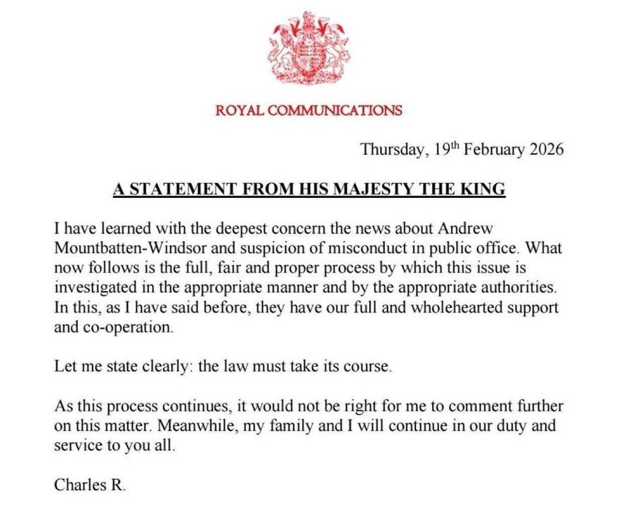 The king’s only statement was the public confirmation of a private power shift— referring to his own brother not as family but as “Andrew Mountbatten-Windsor,” declaring “the law must take its course,” and signing as “Charles R.” — not his royal majesty - not even the King. . “The royal family does not get arrested if the king doesn’t want them arrested,” Shalev said. “He’s let this happen.” William and Kate are rebuilding the monarchy by burning its worst parts down — and that fire is now visible from Washington.