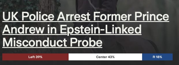 Coverage splits Left 39%, Center 43%, Right 18%. Left-leaning outlets outpacing the rich-leaning outlets by 2-to-1. Left emphasizes “Epstein allegations” and “misconduct” to underscore accountability for elite impunity, often including the potential for life imprisonment. Right-leaning coverage focuses on the drama impacting the royal family, highlighting Andrew as the “favorite son of the late Queen” and using terms like “Epstein bombshells.” Center perspectives maintain a neutral tone, stressing “on suspicion of” and the police investigation process. All agree on the core facts — but the left frames it as a victory for justice while the right frames it as a challenge for the monarchy.