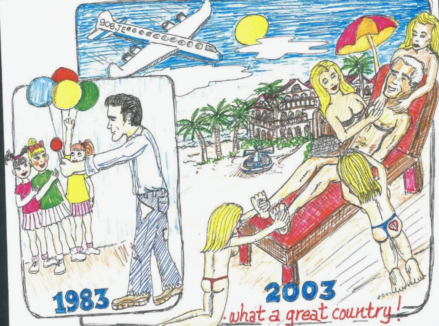 The book's most disturbing image: a before-and-after drawing showing Epstein in 1983 giving balloons to prepubescent girls, then twenty years later on his island with those same girls, now grown and topless, servicing him. The caption: "What a country."