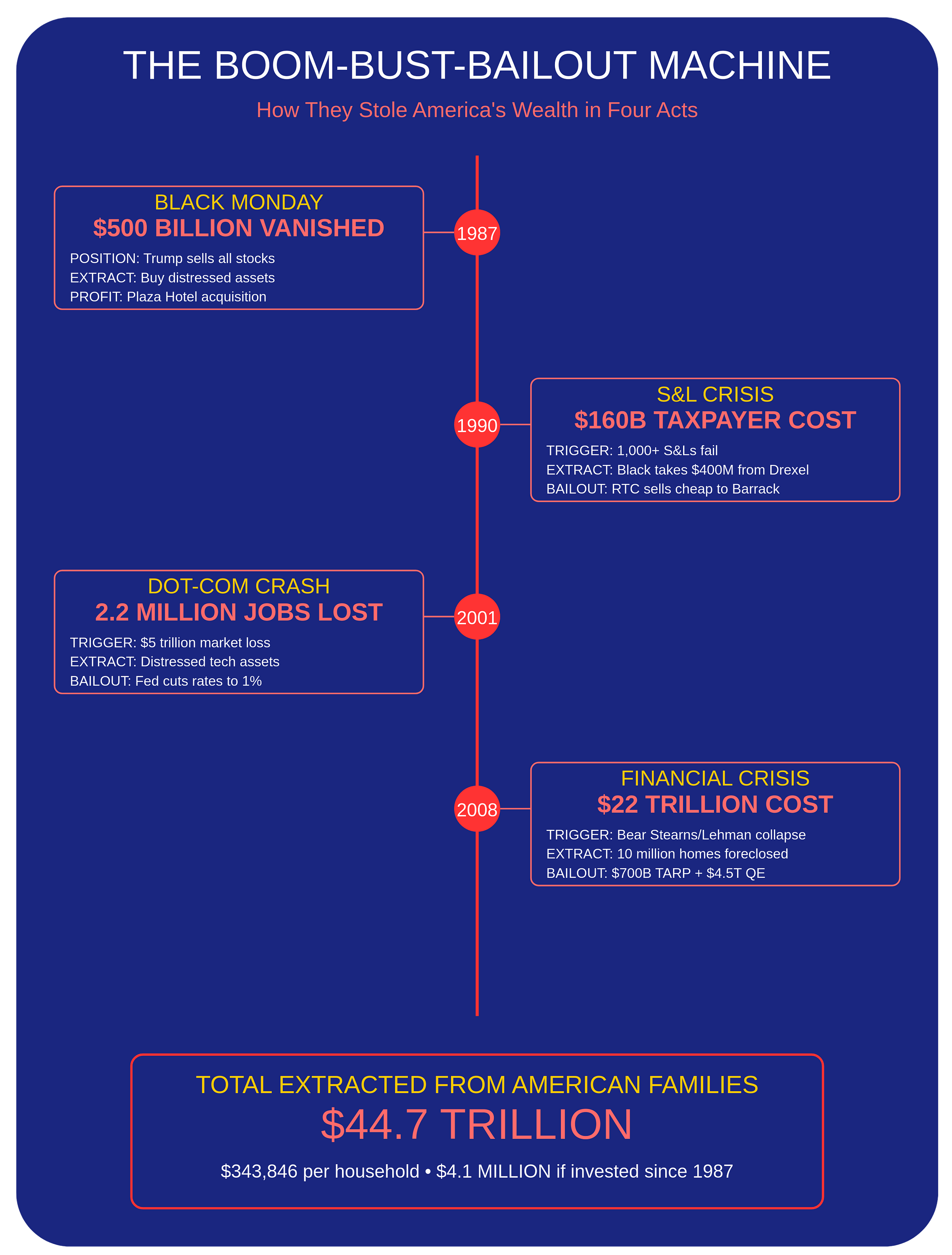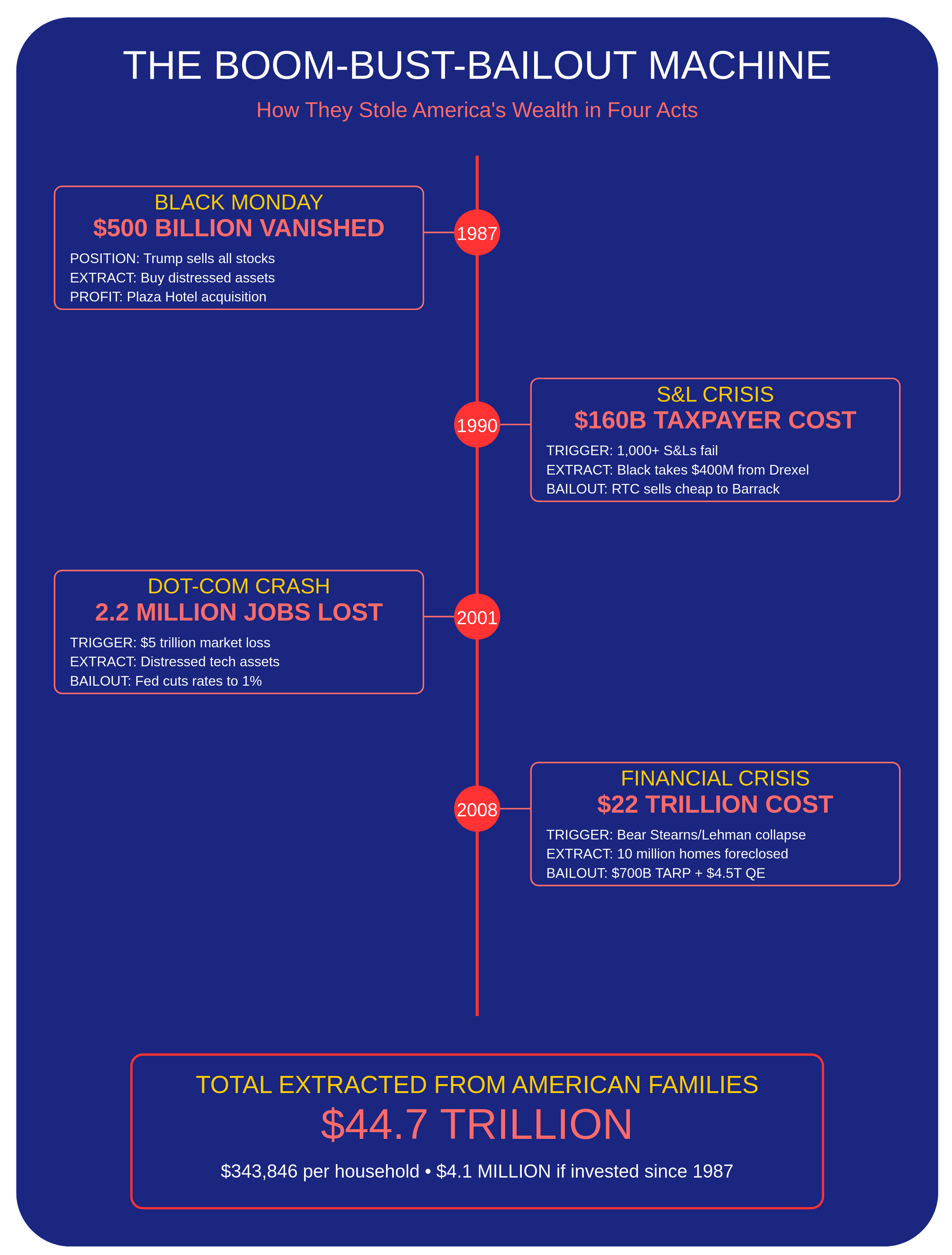 The true cost? $44.7 trillion stolen through direct extractions and systemic destruction. That's $343,846 per American household—money that, if invested at market rates since 1987, would be worth $4.1 million per family today. Every American family had their millionaire future stolen. Every time you see Trump gloating about his ostentatious wealth, remember: it was built with money stolen from you, in a scheme where the victims funded their own victimization through taxpayer bailouts.