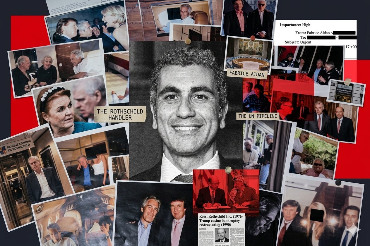 The thread begins with a former French diplomat, Fabrice Aidan, whose connections through the Rothschild family banks link Jeffrey Epstein to Israeli and Russian intelligence, the UN Security Council, and the Oslo Accords.