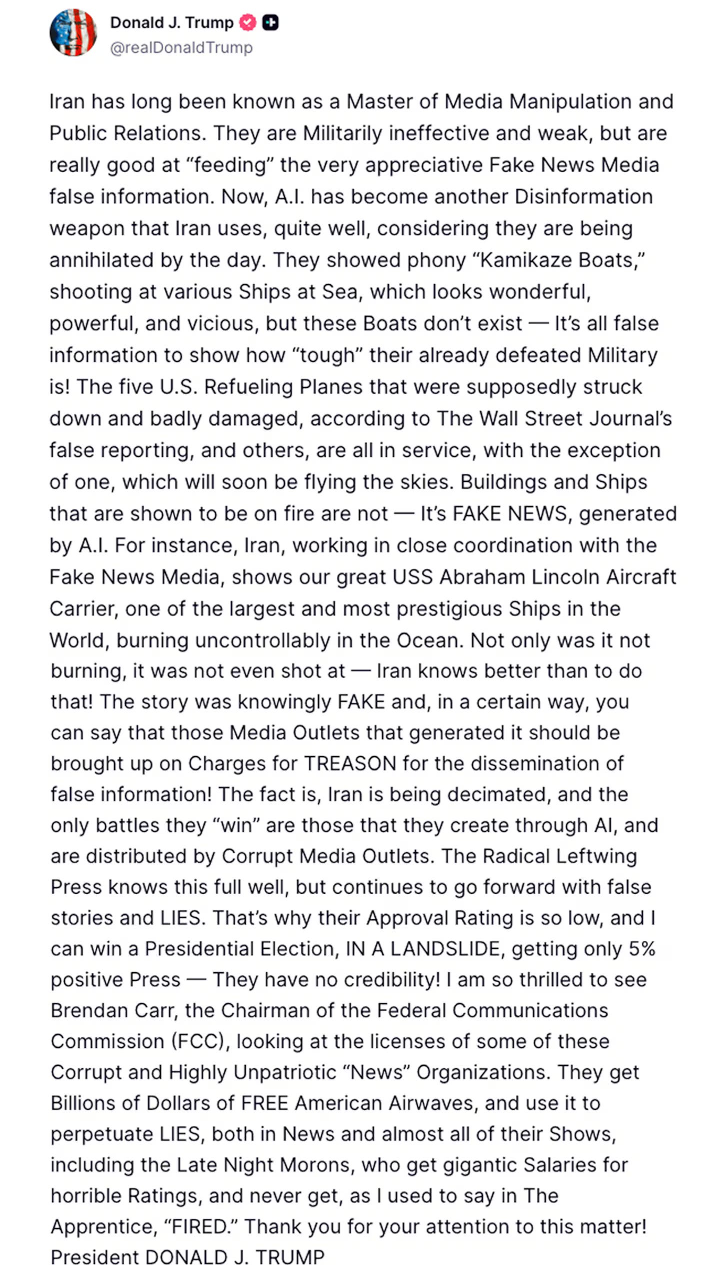 The president of the United States said Sunday that reporters covering his war should face charges of “TREASON.” In a 400-word Truth Social rant, Trump accused the media of spreading Iranian propaganda and said outlets that published critical coverage “should be brought up on Charges for TREASON for the dissemination of false information.” On Air Force One, he doubled down: “I actually think it’s pretty criminal.” Track the escalation: First he threatened the networks. Then he went after the late night hosts. Then he installed Brendan Carr at the FCC to oversee broadcast licenses. Now he’s threatening the lives of reporters. Fighting losing wars. Aiding our enemies. Silencing the media. These are not the signs of a president protecting national security. These are the signs of an empire in collapse.
