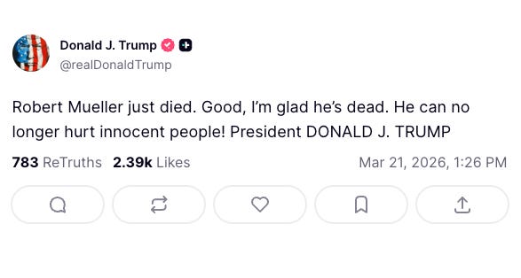 Robert Mueller, the former FBI Director and Special Counsel who investigated Donald Trump’s ties to Russia, died yesterday at age 81 after a long battle with Parkinson’s disease. Within hours, the President of the United States posted this on Truth Social:
