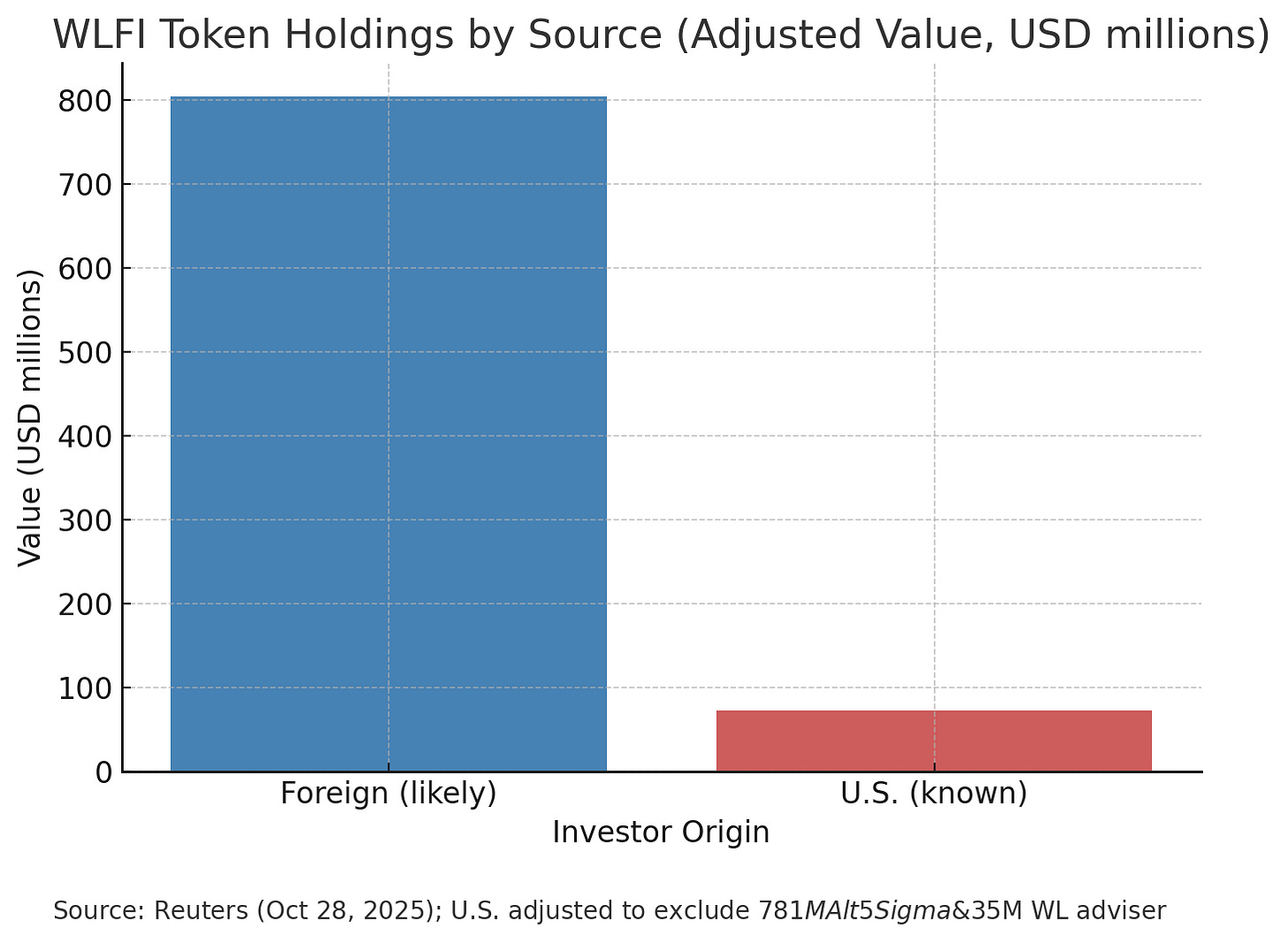 The foreign money isn’t subtle. A Reuters analysis of the 50 largest WLFI token holders found that 36 wallets—valued at $804 million—were likely connected to overseas buyers. Only four wallets traced to U.S. investors, and most of that was a single blockchain company’s bulk purchase.